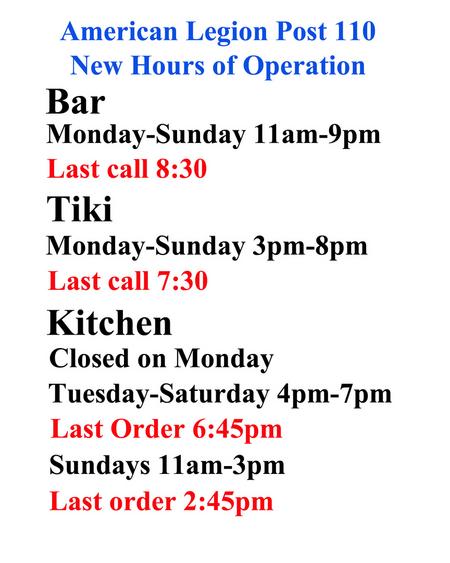 Tiki Bar 2-8 Monday - Sunday Last call 7:30