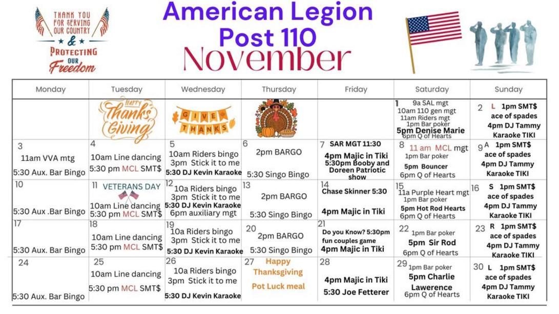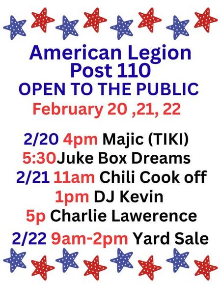 The next monthly meeting of the American Legion Auxiliary Unit 110 will be on first Tuesday of every Month at 6:00 PM.